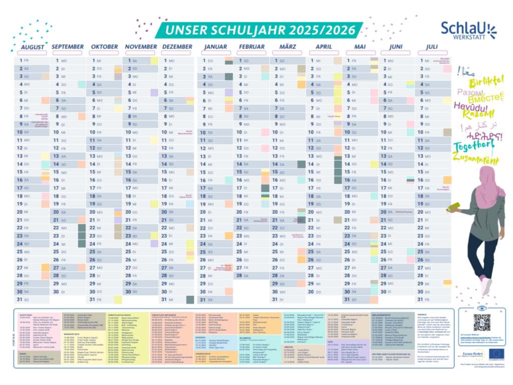 Der interkultureller Kalender wurde im Rahmen unseres Projektes SchlaU:Ankommen erstellt. Das Projekt wird aus Mitteln des Asyl-, Migrations- und Integrationsfonds kofinanziert.