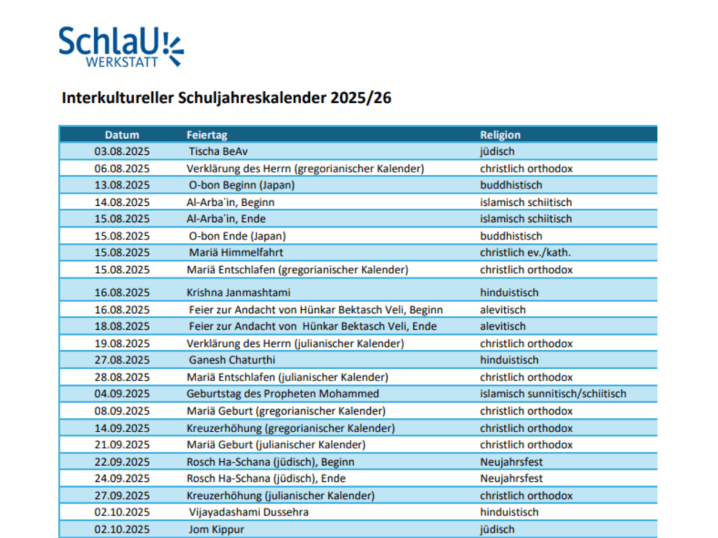 Im SchlaU-Schuljahreskalender sind neben den gesetzlichen Feiertagen religiöse Feiertage aus 12 Religionen auf einen Blick sichtbar. Außerdem haben wir zentrale Gedenk- und Aktionstage für soziale Gerechtigkeit aufgeführt, die über religiöse Bezüge hinausgehen, Lebensrealitäten abbilden und wichtige Gesprächsanlässe bieten.